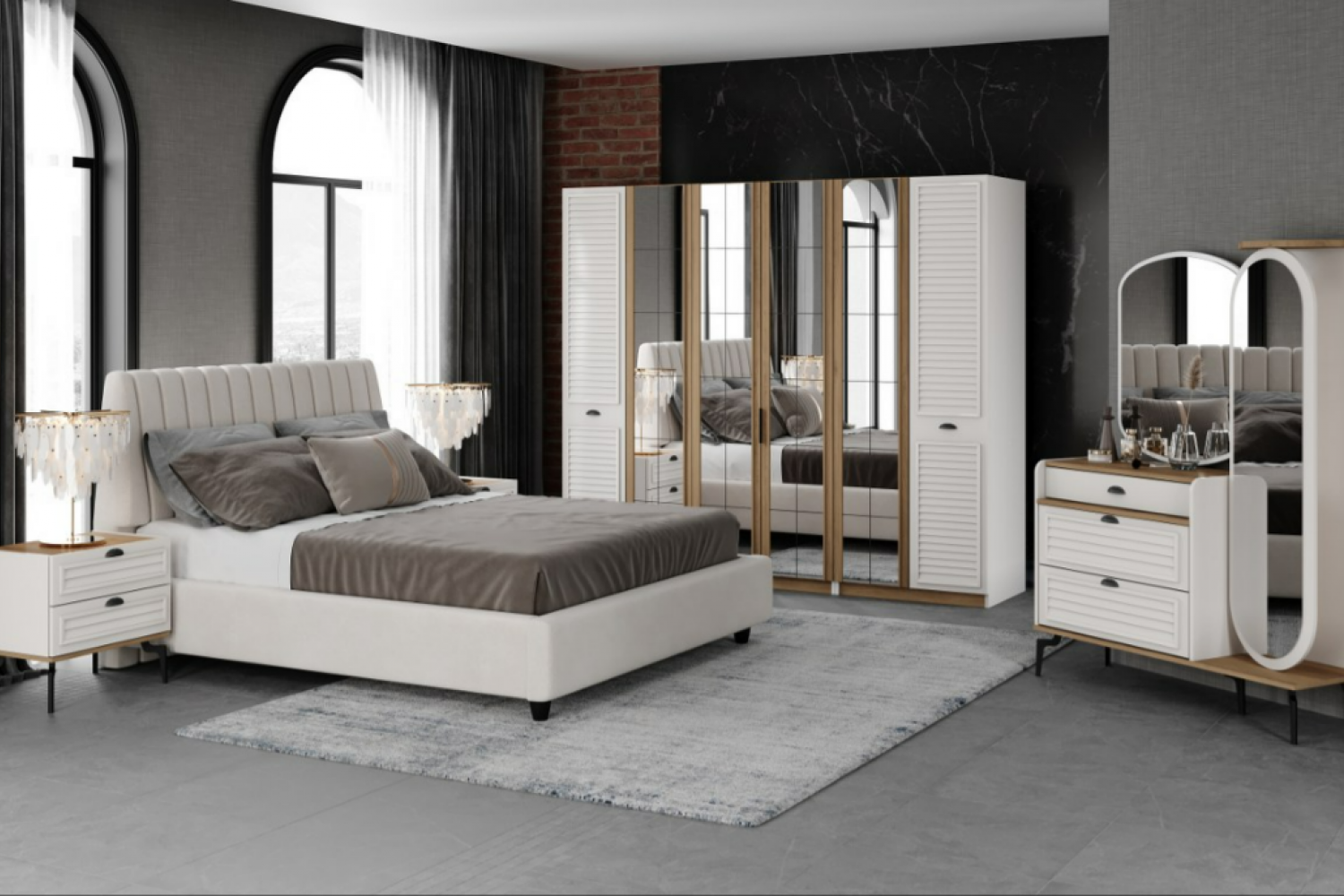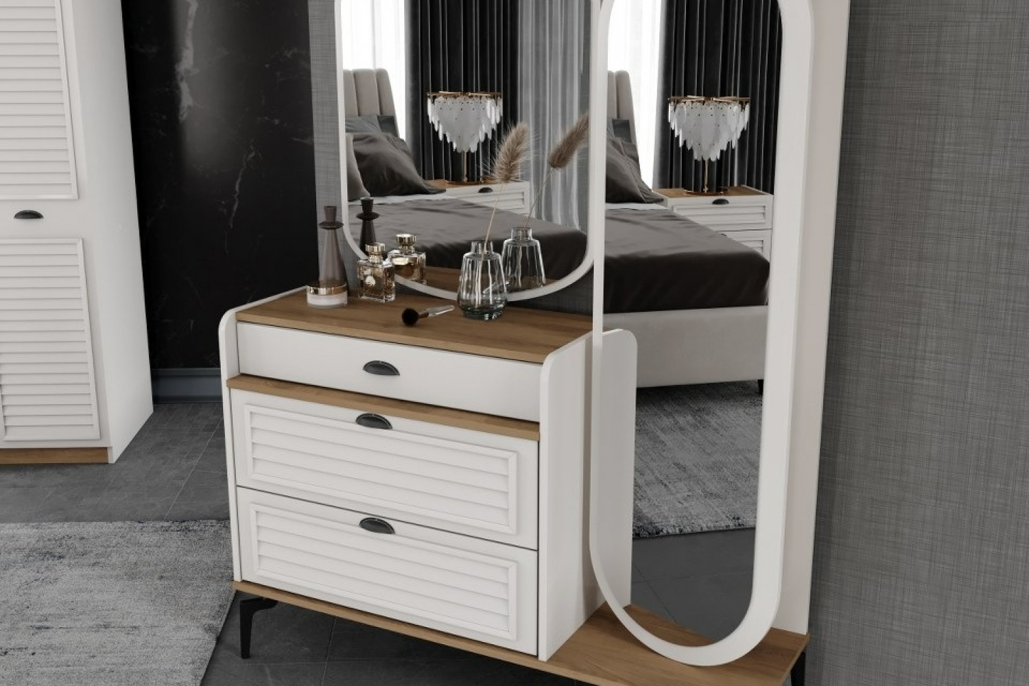 | TAKIM İÇERİĞİ | Bir gardırop, bir şifonyer ve aynası, bir bazalı karyola, bir başlık, bir puf , iki komodin den oluşmaktadır |